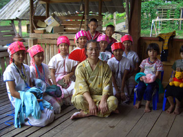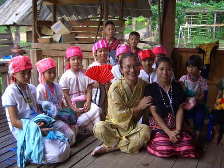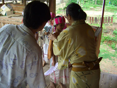 カレン族のこどもたちへ、子供服を手わたしました。 「テラの会」スタッフと、またタイで奨学金をしている方とです。 手わたした子供のかずは、だいたい12人くらいです。 ひとりにつき、一枚いじょうの服を、たしかに渡しました。
