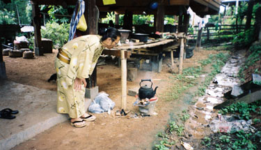 お茶をいれてもらいました。七輪でゆっくりふっとうさせます。 おだやかな朝の風景です。 |