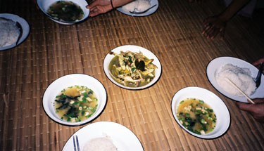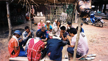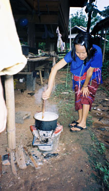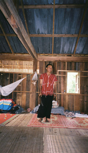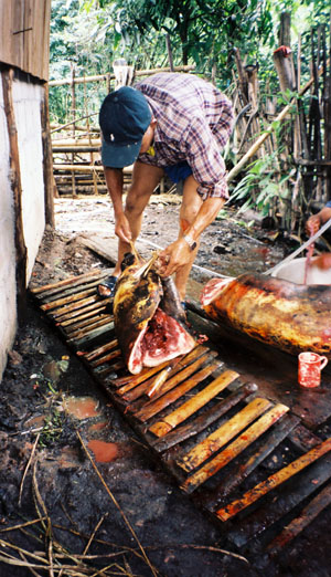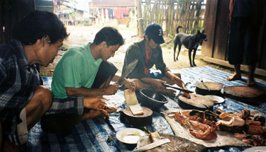 お祝いのためにつぶした豚をふわけしているところ。カレン人は豚に捨てるところはないといいます。 レバーの蒸し焼きを食べさせてくれました。ほんもののレバーの味がしました。 この調理場のすぐ後ろには、もう一匹豚がいました。 その日に食べられる運命らしく、観念していました。 |