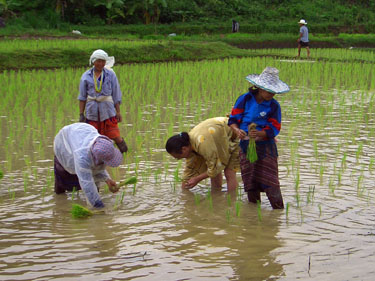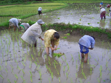 田植えを手伝いました。たくさんの村人でいっせいにやります。 少しやっただけで腰が痛くなりました。 重労働です。 |